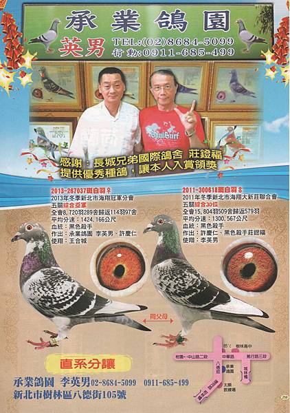 ↑承業鴿園李英男先生刊登廣告感謝本舍