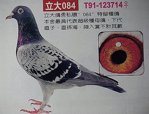 但鴿界中,要像陳前會長這樣公開自己所使用的武器製造方式的人並不多,大部份的人要不是不提鴿號、不然就是鴿子的來源不對外說。其實,會有這種心態是無可厚非,畢竟台灣的鴿界競爭激烈。沒人希望自己種鴿的秘密被人發現。知名網站龍馬賽鴿網這幾天正在拍賣新化蔡先生的鴿子,介紹中提到蔡先生之兄與早期的立大鴿舍王董仔為好友,故蔡先生之兄獲得不少立大的優秀種鴿,如詹森、凡布利安娜及老迪迪…..等。本格也曾提過立大鴿舍自本舍獲得許多優異種鴿,也間接造就了不少鴿界名人的成績更上層樓,如台南信鴿魏理事長的名鴿084。(註2)
