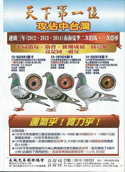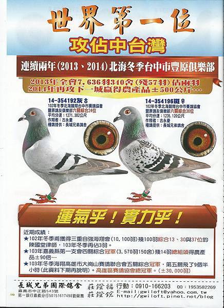所謂的 “家族性” ,就是我們常聽到的 “鴿子是飛那滴血” 的。本舍在二月份的五洲賽鴿廣告中,以簡單的敘述讓鴿友們瞭解 “那滴血” 的重要性。下期再介紹103年冬季大崗山聯合會五關綜合冠軍。