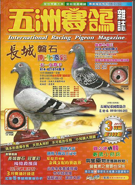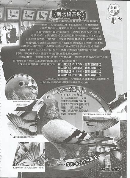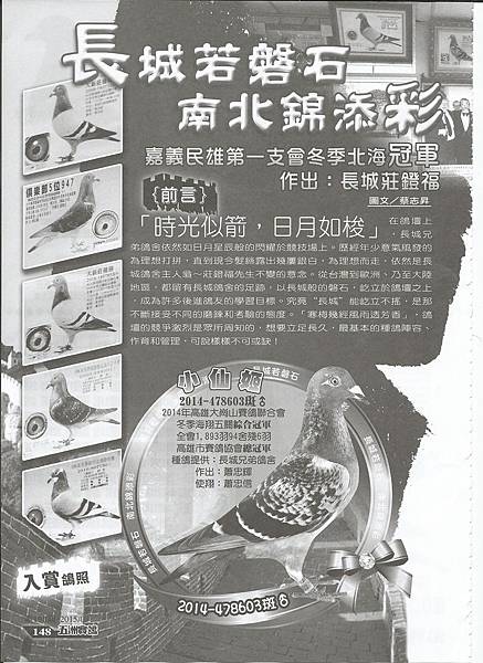 2014年的南海冬季賽算是一個高難度的賽事,各會普遍以殘存羽數達陣。比賽閉幕後,南部蕭姓友人傳來好消息,入賞高雄市大崗山賽鴿聯合會的五關綜合冠軍鴿,是由長城鴿系之 “ 後昌奇蹟066 ”之子交配仙姬號直孫近親所作育出得。本603斑♂不但獲得大崗山會冠軍,也榮獲高雄區賽鴿全船總冠軍之殊榮,為長城兄弟鴿舍添上紀錄一筆。隨後而至的北海冬季賽,原本應趙姓友人請託而掛出參賽民雄第一支會的三羽選手鴿,歷經重重考驗,最後在正四關時全會殘存14羽結束比賽。