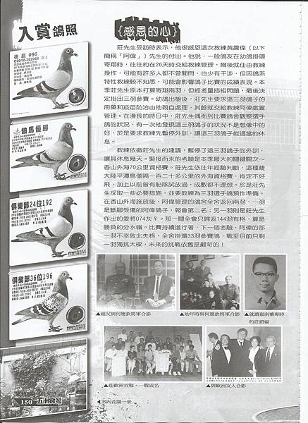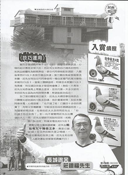 而今年冬季北海,友人筆名 鴿僮 掛出5羽至台中參賽,用的是長城歐洲之鑽系列,第四關時成績不錯報四關綜合一位,但對方卻無回報最終成績的消息,讓鴿僮無言。而此役民雄冠軍的血統為 “天一殺手” 號♂,本身09年獲民雄綜合14位入賞,其妹鴿獲綜合15位入賞,屬於較晚熟型鴿系。這次莊先生將其交配 “金童玉女” 系列,牠是屬於早熟且具速度性的鴿子,這次作出屬於第一次嘗試。但莊先生對自己的鴿子有信心,選將插組時074灰♀就被選為總組頭,後來在教練阿偉認真照料下,這羽 “總組頭” 果不負所望,順利奪魁,也為三人帶來財富和喜悅。這間接印證了長城鴿系如磐石般的屹立於鴿壇之上,不時的接受磨鍊,也不時的發光發熱!