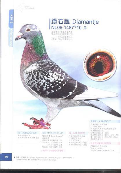 當初,”鴿僮” 自本舍引進 “歐洲之鑽”鴿系,後來卻嫌得要死,除了手感不佳之外;明明是噴點鴿,作出下代卻雙邊都是白羽? 這時,本人僅笑笑地並拿出相關資料給 “鴿僮” 看,這時才瞭解,原來是隔代遺傳。而且,鴿子醜有什麼關係? 牠就飛出四關綜合冠軍,把實力表現給主人看啊 !! 所以,還是一句老話,鴿子不是用看的;而且好鴿真的是不寂寞。