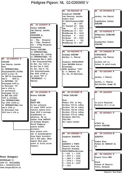 全國雌鴿1,580羽冠軍.2005年達克斯全國3,105羽6位、國際雌鴿1,930 羽5位、