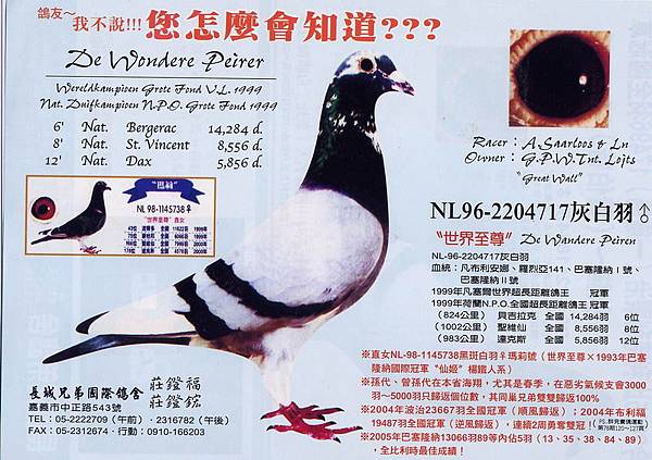 果然 “ 薑還是老的辣”,老將 諾爾.佩倫在長距離及超長距離賽事的表現一直都很出色,大大小小的優異成績不勝枚舉。他曾獲得多個K.B.D.B全國最佳鴿舍與多項全國冠軍頭銜,在多項長距離及超長距離的賽事中亦佳績不斷,當然省賽和俱樂部的優勝就不用說了。本舍的「世界至尊」即出自諾爾. 佩倫之手,而2015年巴塞隆納比利時全國冠軍 B10-3172518 亦有「世界至尊」NL96-2204717 的血統,B10-518 的母親為「世界至尊」的下代鴿。因此,好鴿真的是不寂寞,優異的鴿質,總能帶給鴿主無限的榮耀。