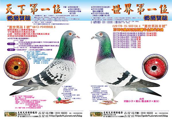 上篇介紹了本舍 “蓋世男孩 I” ,牠是超級種鴿 “奶酪小子” 家族直系,本篇介紹本舍另一羽該家族的成員 “蓋世男孩 II”CZ0178-15-5031灰 ♂.