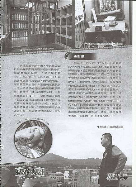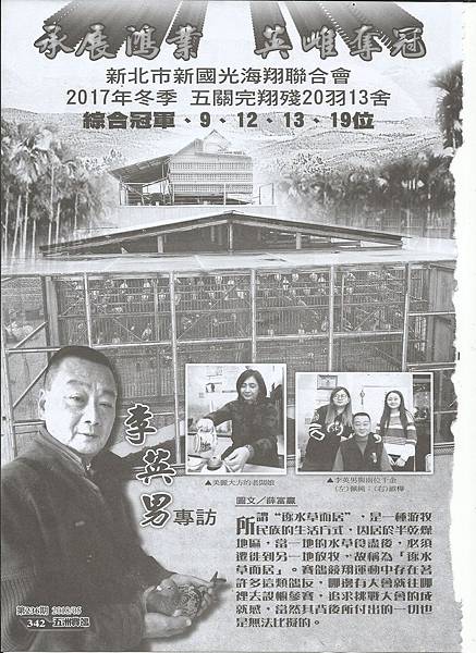 當年北上除了繼續參賽外,李英男也一邊經營檳榔生意,但為了讓生活更加穩定,2012年開始又重拾本行在樹林區經營 “承業鴿園”服務鴿友,美麗大方的老闆娘與兩位漂亮女兒是目前鴿店的好幫手,讓李英男專心管理賽鴿無後顧之憂;虔誠的信仰、有拜有保庇,地方上的宮廟慶典也是全家熱心參與的重要活動之一。說起與 長城兄弟國際鴿舍 ~ 莊鐙福 的結識,早在北港開鴿店陸翔時期,兩人即有如兄弟般的交情,彼此互動與鴿子的交流更不在話下,只是當年剛北上時忙著拼經濟而較疏於聯繫,直到有一天,鴿友許慶仁說想去找莊董買鴿子,李英男便主動陪同一起南下找莊董,讓許慶仁鴿友順利引進,並且作出入賞:2011-300618斑白羽♂,