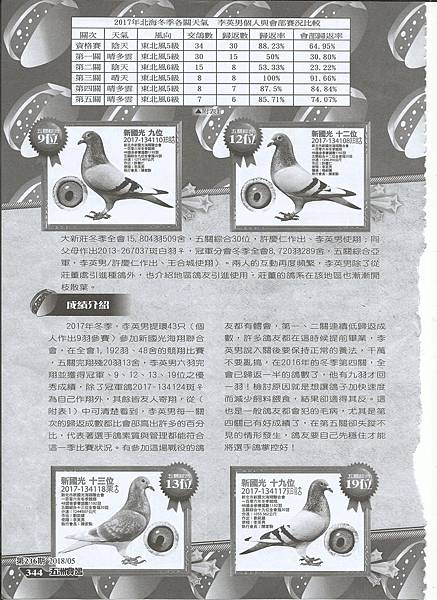 2017年冬季,李英男提環43只 ( 個人作出9羽參賽 ) 參加新國光海翔聯合會,在全會1,192羽、48舍的競翔比賽,五關完翔殘20羽13舍,李英男六羽完翔並獲得冠軍、9、12、13、19位之優秀成績,除了冠軍鴿2017-134124斑♀為自己作翔外,其餘皆友人寄翔,從 (附表1 )中可清楚看到,李英男每一關次的歸返成數都比會部高出許多的百分比,代表著選手鴿素質與管理都能符合這一季比賽狀況。有參加這場戰役的鴿友都有體會,第一、二關連續低歸返成數,許多鴿友都在這時候提前畢業,李英男說入關後要保持正常的養法,千萬不要亂搞,在2016年的冬季第四關,全會已歸返一半的鴿數了,他有九羽鴿子才回一羽! 檢討原因就是想讓鴿子加快速度而減少飼料餵食,結果卻適得其反。這也是一般鴿友都會犯的毛病,尤其是第四關已有好成績了,在第五關卻失蹤不見的情形發生,鴿友要自己先穩住才能將選手鴿掌控好!