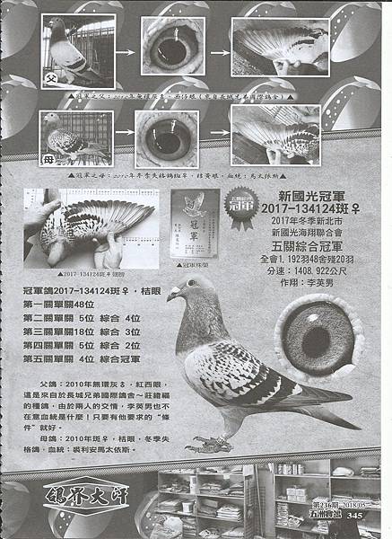 本配對已作出2015-809336灰♀新國光冬季全會4,498羽、168舍,五關綜合29位 (殘120羽) (與冠軍鴿為全姊妹);孫代2017-132053斑♀ 入賞新國光春季一關綜合15位 (殘17羽)