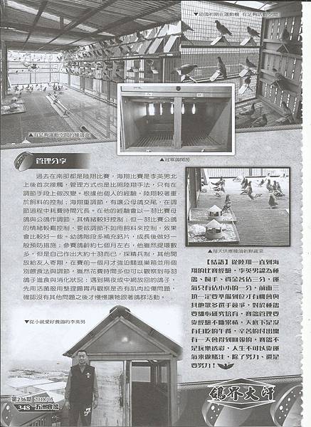 過去在南部都是陸翔比賽,海翔比賽是李英男北上後首次接觸,管理方式也是比照陸翔手法,只有在調節手段上做改變。根據他個人的經驗,陸翔較著重於飼料的控制;海翔重調節,有讓公母鴿交尾,在調節過程中耗費時間冗長。在他的經驗會以一羽比賽母鴿與公鴿作調節,其情緒較好控制;但一羽比賽公鴿的情緒較難控制,要做調節不如用飼料來控制,效果會比較好一些。幼鴿階段多補充鈣片,成長後做好一般預防措施;參賽鴿齡約七個月而已,採精兵制,其他開放給友人寄翔,在賽前一個月才強迫關進巢箱並用個別餵食法與調節,雖然花費時間多但可以觀察到每羽鴿子進食與消化狀況;遇到隔夜或中網放回的鴿子,先用活菌服用整理腸胃再觀察是否有肌肉拉傷問題,確認沒有其他問題之後才慢慢讓牠跟著鴿群活動。