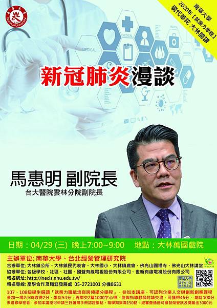 此次,「大林健康講座」 請來了 台大醫院雲林分院 馬惠明 副院長,以“新冠肺炎”為講座主題,讓大家更進一步瞭解此病毒的特性與其可怕之處,且教導個人如何進行防護工作。