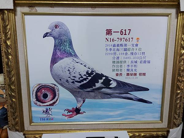 ↑第三代:第一617 ( N16-797617 ) : 2016年嘉義第一支會冬季北海三關綜合8位,2655羽,123舍,殘23羽