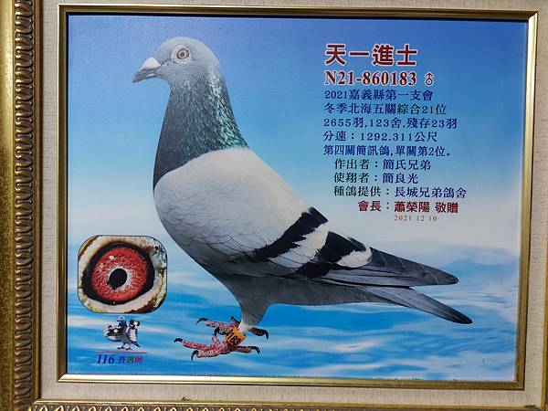 ↑第四代:天一進士 ( N21-860183 ):2021年嘉義第一支會,冬季北海五關綜合21位,2655羽,123舍,殘23羽