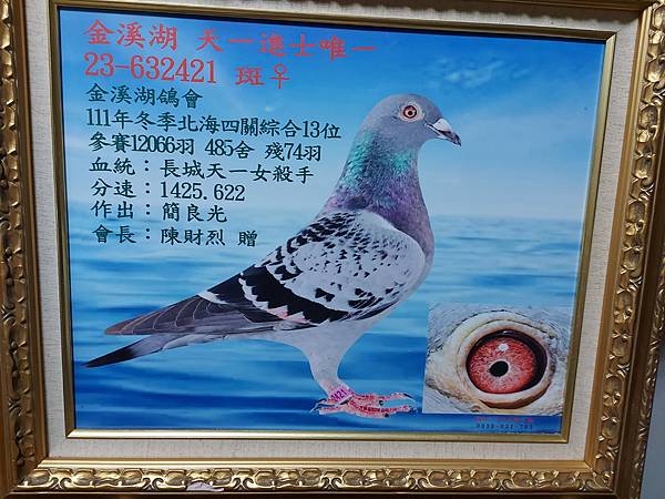 ↑第五代:金溪湖天一進士唯一 ( 23-632421 ):2022年 金溪湖支會,冬季北海四關綜合13位,12066羽,485舍,殘74羽