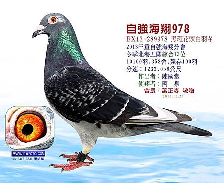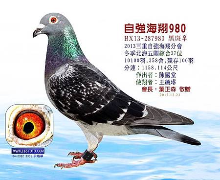 鄭金城先生 對台灣鴿界的貢獻,故取名 “天一紀念號”。