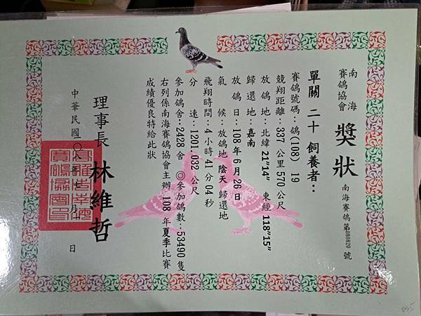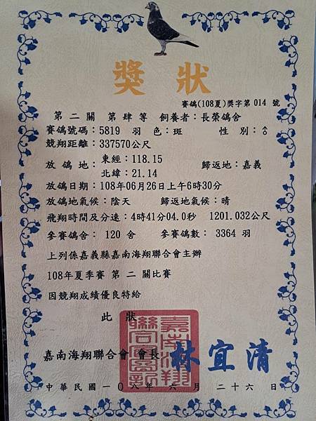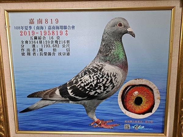 ↑2016年 嘉義第一支會的冬季賽事,本舍鴿系獲三關綜合8位(殘12羽)。