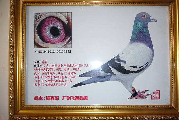 ↑2012年廣州市冬季元旦盃 600公里大賽,阿森在此賽僅掛一羽即獲得冠軍,而且在所有的獎項皆為冠軍。