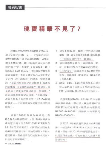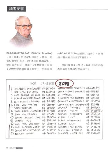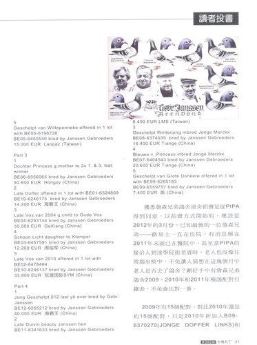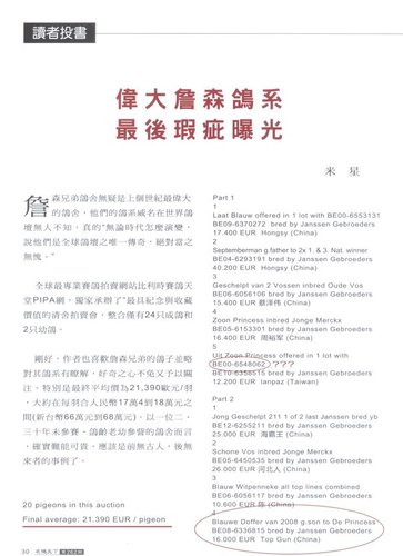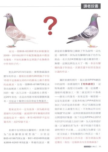 在最新一期的 “名鴿天下” 雜誌中,刊出一篇讀者投書的文章,作者明確點出一些問題點,包括了某些鴿子並不在拍賣名單內、某些鴿沒有詹森兄弟親手書寫的血統表……等等的疑問。我想,到底這些是不是詹森兄弟舍內最後留存的鴿子? 就讓鴿友們自行判斷吧。