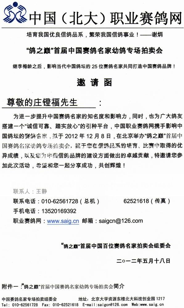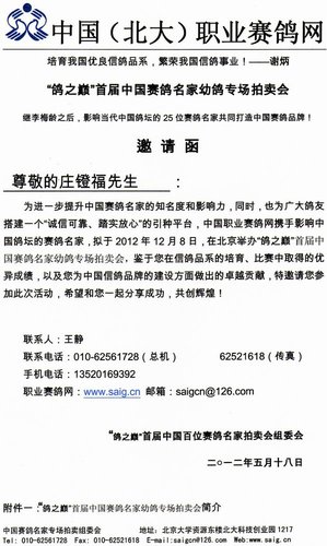 ↑鴿之巔”首屆中國賽鴿名家幼鴿專場拍賣會 之邀請函