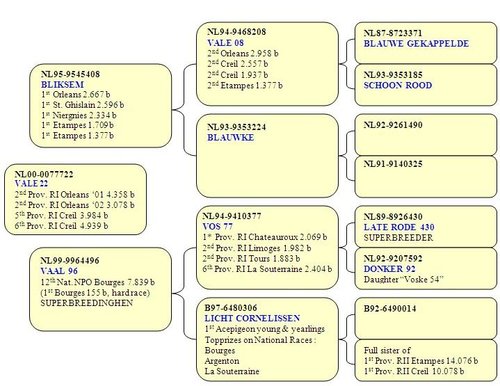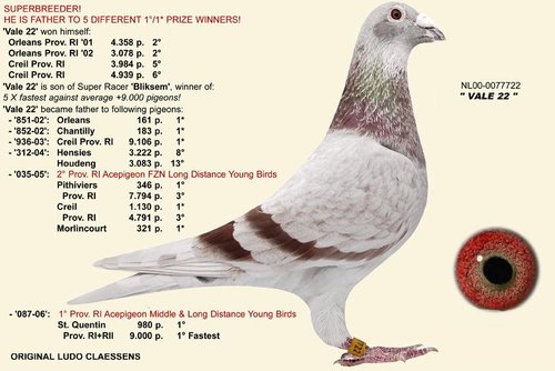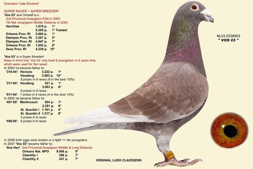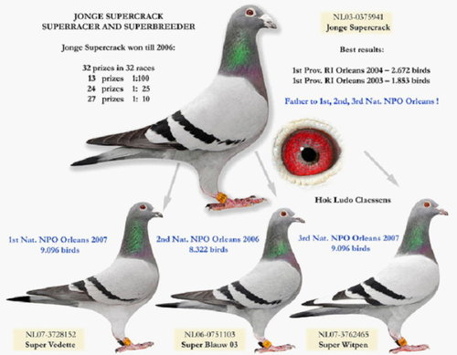本鴿與"雪天使"(克里爾 9106羽 省賽冠軍) 同父 與"年青超級克拉克"(20032004奧爾良連續兩年全省冠軍) 同祖母.集 "晚生黑斑" 近親.