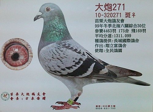 大炮207為98年北海冬季 苗栗北區大炮鴿友會 五關綜合35位(4015羽、154舍、殘35羽)