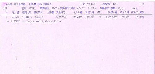 先生去年第1次向本人引進種鴿,並參加桃園中正會冬季賽事,在第三關時獲得綜合1位,第四關全會歸返50羽,該舍佔2羽,第5關全會歸返31羽,該舍歸返1羽,並獲得綜合10位。