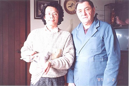↑羅傑.富雷卡手持 B04-3000159 此鴿為本舍 B88-3340032(小土匪) 之第七代