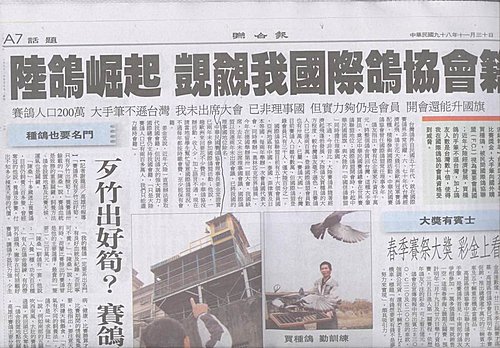 不過,今非昔比,大陸賽鴿界隨著經濟起飛蓬勃發展,大陸鴿友買種鴿的大方程度,較台灣鴿友毫不遜色,且賽鴿人口已達兩百萬,登錄國際鴿盟會員數也有卅萬人,已屬「賽鴿大國」,台灣目前賽鴿人口雖有數萬,但國際鴿盟登錄會員只有三千人,僅大陸百分之一。
