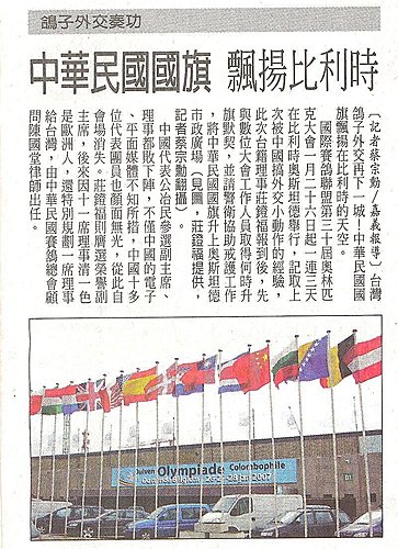 非常尊重我國 ,並於去年10月份K.B.D.B.王立賽鴿協會( 歐盟主流, 所有歐洲國家均會參加 ) 國王親臨頒獎.特別邀請我國參加 (並沒有邀請中國參加. 我國是亞洲唯一獲邀請國 ) 吃.住.及交通 (在比利時的一切費用) 全部由K.B.D.B.招待.唯机票自行負擔.是非常難得外交机會. 莊 顧問曾向 外交部國際事務委員會報告所得到的答覆 不是國際會議.不予補助 (因此尚失一次重要國際會議).