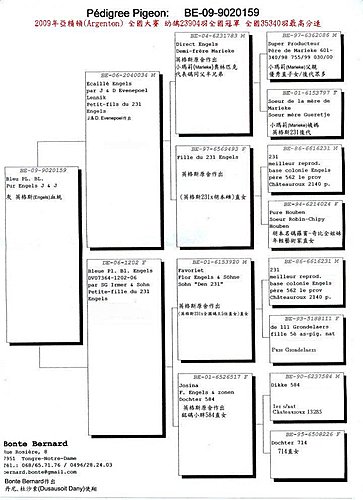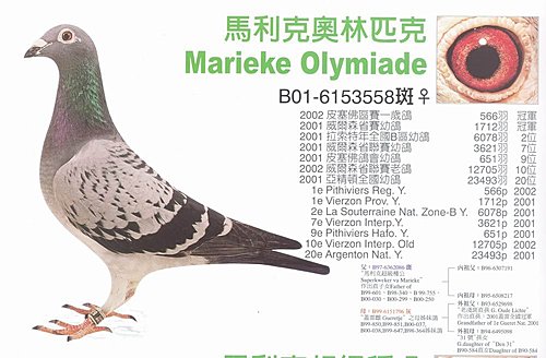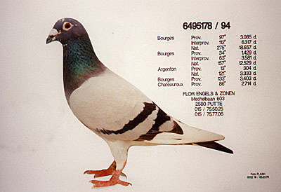 B90-6237584 (De 584) De584 為超級種公 英格斯231 的直子, 其第4代鴿為下圖 "馬利克奧林匹克"。 1992 查特魯 省賽 老鴿 1848羽 2位 1993 波提爾 省賽 老鴿 1932羽 4位 1993 波治 全國 老鴿 9759羽 10位 1994 查特魯 半全國 老鴿 13285羽 冠軍