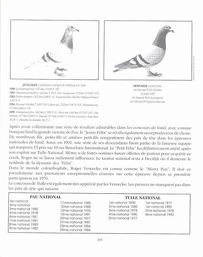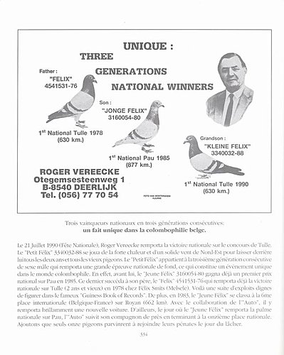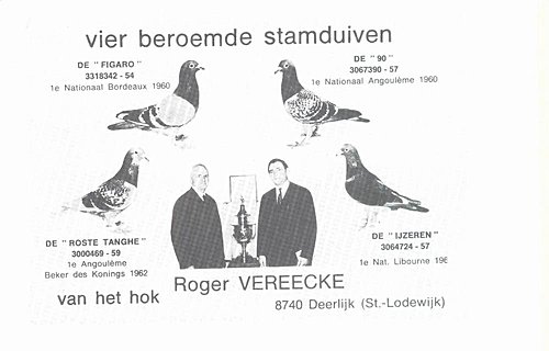 比利時長距離名將:羅傑.富雷卡 (Roger Vereecke) 參加2009年波城(Pau)國際賽,獲得比利時全國冠軍,國際6位。冠軍鴿為 B04-3000159 (Tarbes),此鴿並於2008年贏得塔比斯全國4660羽14位、國際12537羽26位。