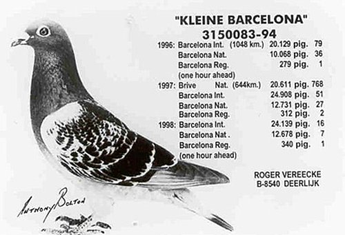 這裡特別介紹 羅傑.富雷卡 的一羽名鴿 --- B94-3150083 Kleine Barcelona 小巴賽隆納。牠於1996年~1998年連續三年參加巴賽隆納,其成績如下: