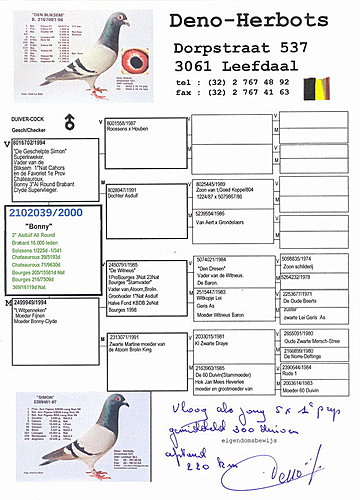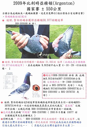● 2009年亞精頓國家賽30977羽總冠軍B08-2059168的親伯父 " 邦尼 " B00-2102039 ,邦尼在幼鴿時,榮獲五次冠軍 ,這最適合台灣目前 幼鴿賽制度。邦尼 及 狄諾 300號 此為長城兄弟國際鴿舍引進之 最大因素之一。 ( 其後代已在台灣亦贏得許多大獎 )。 ↑B00-2102039 邦尼 (與 B00-2102040 同孵) 由長城兄弟國際鴿舍引進 ↑邦尼的血統書 ↑狄諾300號 (與 B00-2102039、B00-2102040同父母) 由長城兄弟國際鴿舍引進 ↑迪諾 300號 之血統書