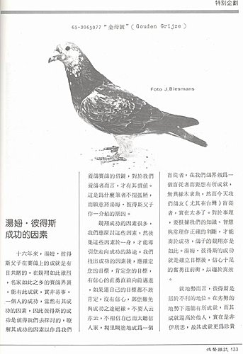 從1972年起至今十六年來,每一年都有相當優異的突出成績表現,這是非常難能可貴的,但賽鴿名家 湯姆.彼得斯父子(Thomas Peeters & Zoon ) 做到了。當我們審閱其十六年來的翔績紀錄,我們會驚訝於此項輝煌的賽績,並由衷也萌生敬意,其賽績即使在賽鴿王國的比利時,亦是首屈一指的。一九八八年K.B.D.B的國家優勝者中,不管在長、中、短距離及幼鴿賽事中,皆有很優秀的成績。且有二隻鴿子入選一九八九年比利時奧林匹克代表隊,長距離及長距離母鴿的入選鴿,由此可知彼得斯的鴿子不但比賽的成績很好,而且很漂亮。彼得斯的鴿子不但在比利時的成績出奇的好,即令輸進台灣者亦有相當優異的成績表現。今天在世界鴿壇上,名系名鴿之多如過江之鯽,輸入台灣者亦多得不勝枚舉,但能像湯姆.彼得斯那樣優異的成績,而且綿延不斷者,真是寥若晨星。