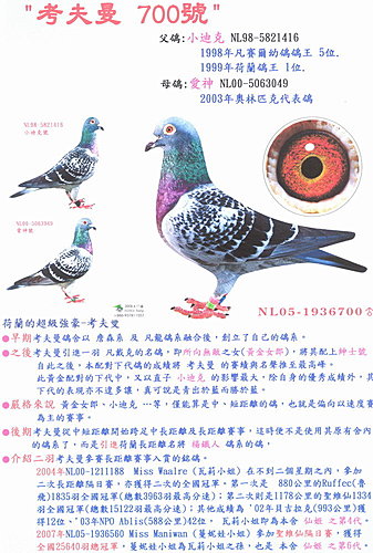 ↑ 本鴿為 荷蘭強豪 考夫曼的大名鴿 --- (小迪克 X 愛神) 的直子,曾看過一篇廣告,說 小迪克 X 愛神 的直子女 僅有8羽…..,但事實上,至少有9羽以上,因為本人還珍藏這羽700號。