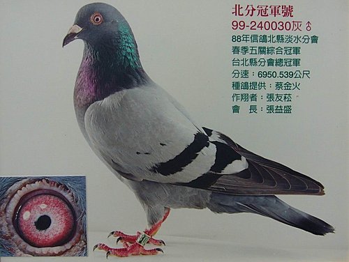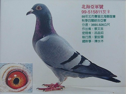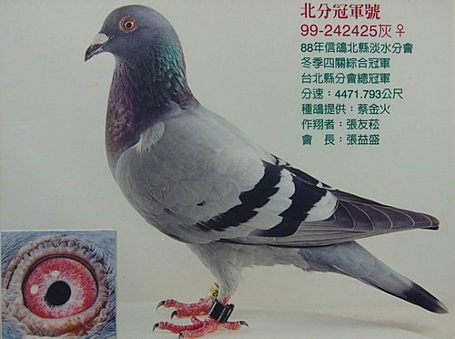 台南鴿友來訪,在欣賞本舍所陳列的鴿照時,發現一個令他佩服不已的成績。原來是二張1999年的台北縣分會總冠軍的鴿照,一張春季一張是冬季的,二張都是由同一人所獲獎,而且已是近十年前的事了。當時能夠入賞 “北分” 是極其榮耀的事,更難得的是竟然由同一人在同一年度獲得二次 “北分總冠軍”。此鴿系源自本舍, 台南鴿友盛讚本舍種鴿素質為 “超級種鴿”。