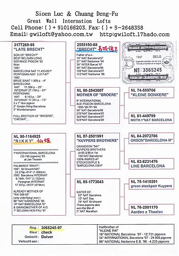 ↑ Rikky245的血統表,本鴿為仙姬直子、長城鴿王直孫,