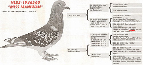 ↑ 蔓妮娃小姐的 鴿報資料,右為詳細血統表,紅線畫記