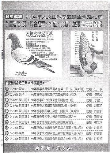 以上成績係包括公訓台東延長時間歸返鴿全部,台北縣分會五關綜合優勝金錶賞。員山支會五關綜合亞軍(含延長賽)。三K組、單隻、雙隻、參隻、肆隻組等全部伯馬。